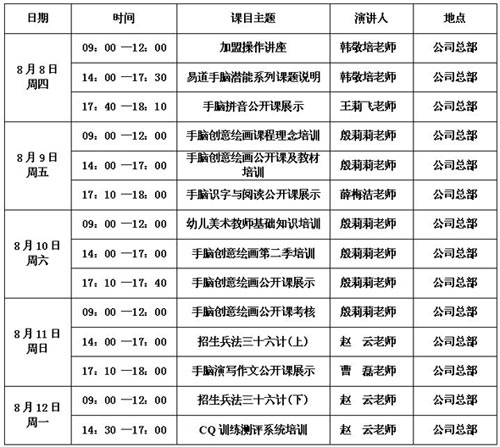 應全國易道部落老師強烈要求,易道教育將于8月8日在合肥總部舉行新一期易道部落師資培訓,望全國各地有意加盟易道教育以及對幼兒教育發展感興趣的老師們前來考察學習,名額有限,報名從速!欲知詳情請聯系加盟事業部夏曼老師,咨詢電話:0551-62551875。總部地址:中國 安徽省 合肥市 長江中路98號銀泰中心寫字樓22層,易道中國加盟熱線:400-676-6760。
