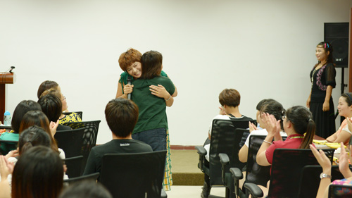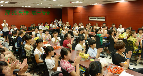 心語師苑是為遠(yuǎn)道而來的老師們建造的一處心靈港灣,聯(lián)歡會(huì)現(xiàn)場(chǎng)氛圍輕松而愉快。首先為大家播放了一段視頻,那是用鏡頭記錄五天培訓(xùn)里的點(diǎn)點(diǎn)滴滴,每一個(gè)瞬間串在一起都是一個(gè)個(gè)精彩的故事;隨后總部老師和部分部落老師紛紛上臺(tái)表演節(jié)目,贏來陣陣掌聲;會(huì)間還玩起了“擊鼓傳花”、“你劃我猜”等趣味游戲,每一位老師臉上都露出了快樂的笑容;最后為八月過生日的參訓(xùn)老師們舉辦了溫馨生日會(huì),燭光、賀卡、許愿、祝福……匯成了《明天會(huì)更好》,也在《明天會(huì)更好》的集體合唱歌聲中結(jié)束了本次心語師苑聯(lián)歡會(huì)。
