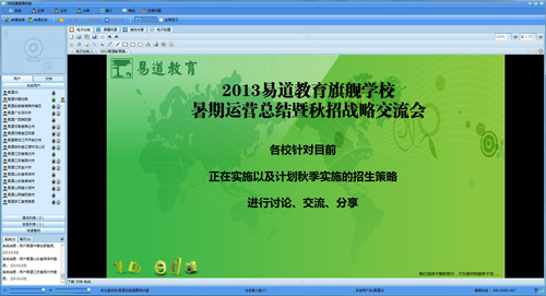 2013年08月16日、17日晚上,通過好視通網絡視頻會議軟件,總部老師和各部落校長經過兩個晚上共計六個小時的積極討論,共同分享,2013易道教育旗艦學校及高端客戶秋招戰略交流會于17日晚上十點圓滿結束。雖然各位老師付出了休息時間,但收獲的知識是無價的,相信易道每一季為各部落校長準備的招生策略在實操過程中都能起到相當大的作用。