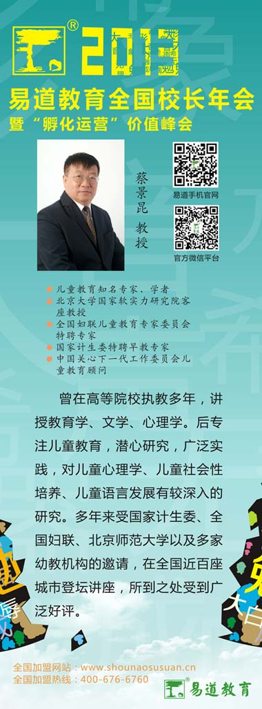 2013年10月30日,全國校長年會第二天上午九點整,易道教育邀請到著名早期教育專家蔡景昆教授,并帶來了幼教專題講座——《角色游戲在兒童成長中的作用》。