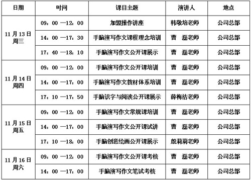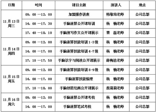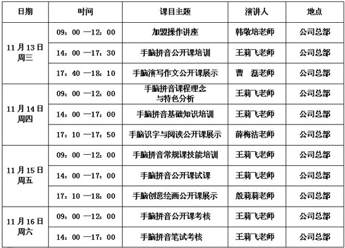 應全國易道部落老師強烈要求,易道教育將于11月13日在合肥總部舉行新一期易道部落師資培訓,望全國各地有意加盟易道教育以及對幼兒教育發展感興趣的老師們前來考察學習,名額有限,報名從速!欲知詳情請聯系加盟事業部夏曼老師,咨詢電話:0551-62551875。總部地址:中國 安徽省 合肥市 長江中路98號銀泰中心寫字樓22層,易道中國加盟熱線:400-676-6760。
