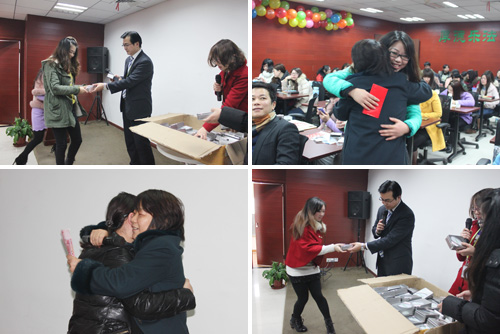 第一項就是“易道春聯大聯歡”,通過全體老師的投票,最終由運營管理部李春老師、旗艦學校楊楠老師、巴布嚕事業部史赟老師獲得前三甲,并贏得巴布嚕書包一個。緊接著總經辦祝老師為“最佳易道調查問卷填寫者”夏曼老師頒發獎金,這是三個月前公司給予的承諾,以易道為家,從這里出發!易道也為每一位家人精心準備了新年禮物,印有易道教育標志的移動充電寶,讓你與外界聯系永不斷電,更有新年紅包,壓歲平安,歡歡喜喜過大年。