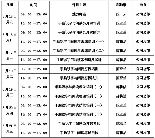 師資特訓班培訓·手腦識字與閱讀課程表: