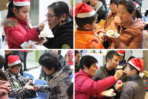 游戲結束后由小朋友的好伙伴小易和小道推著生日蛋糕閃亮登場了,小伙伴們圍著蛋糕各自許下了生日愿望并吹滅蠟燭。吃蛋糕嘍,第一口蛋糕自然是要喂給最疼寶貝最愛寶貝的爸爸媽媽們,其樂融融,溫情脈脈的場面,讓會館內充滿了愛的味道。