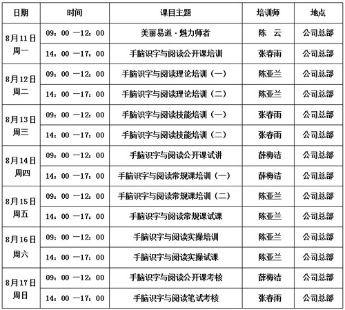 師資特訓(xùn)班培訓(xùn)·手腦識(shí)字與閱讀課程表: