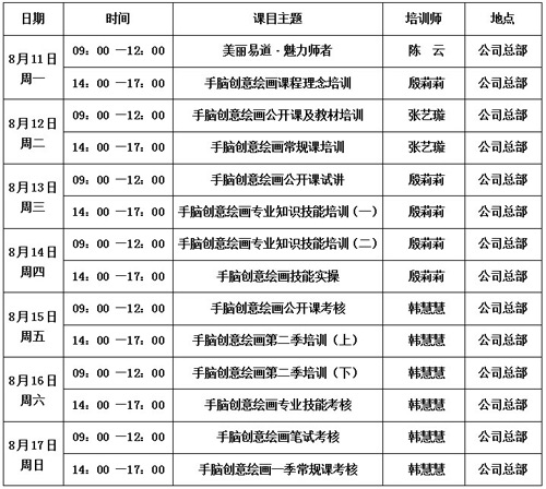 師資特訓(xùn)班培訓(xùn)·手腦創(chuàng)意繪畫(huà)課程表: