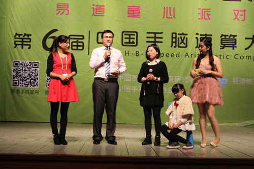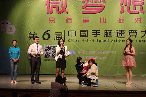 本次大賽中,我們邀請了一位特別的嘉賓,來自徐州部落的肖心怡。一歲時,小心怡被檢查出了腦癱,為了治療,媽媽帶著小心怡走遍了全國各大醫院,花光了所有的積蓄,但是療效甚微,正常的行走、奔跑,對小心怡來說,是一件很奢侈的事情。媽媽沒有因此而放棄,在家里每天堅持為女兒做各類康復訓練。肖心怡的媽媽彭貝女士看到了易道手腦速算的課程,了解到它不僅僅是速算,更能以速算為載體達到手腦潛能開發的目的,就立即帶女兒報了名,經過近一年的課程學習,肖心怡小朋友取得了驚人的進步,兩位數的直加直減已經能運算自如,在大賽的舞臺上,小心怡不僅展示了自己的學習成果,還以一首《隱形的翅膀》向媽媽表達自己的愛,小心怡的歌聲不是最好聽的那一個,但一定是最感人的那一個,因為現場有許多的觀眾都在悄悄擦拭眼角的淚水。