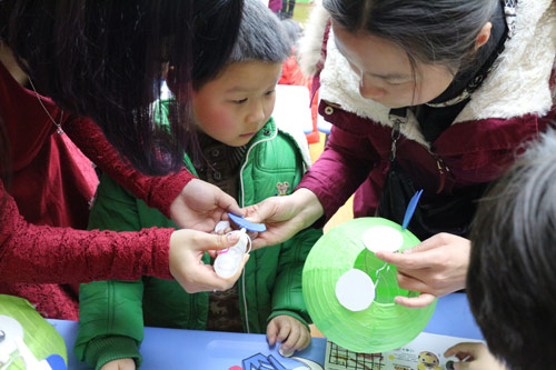 手腦操結束后,小朋友們和家長就玩起了“抓尾巴”游戲,彼此不熟悉的小朋友開始熟悉了,小朋友和家長的愛也在游戲中盡情綻放。游戲過后,宋老師和瑩瑩老師現場示范教授制作精美的燈籠,小朋友在家長和老師的幫助下,親手制作了可愛非凡、栩栩如生的貓咪、青蛙、熊貓、螃蟹和老虎燈籠。