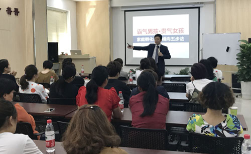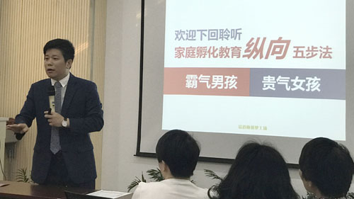 諸暨市電視臺節目主持人趙婷女士主持全場講座,微信紅包小游戲活躍全場氣氛后,諸暨市易道部落許校長致開講詞,接下來由中國手腦潛能教育研究院執行院長,中國家庭孵化教育工程首席導師,易道教育集團常務副總經理、副校監季永剛先生作為本次講座的主講人,為大家介紹“霸氣男孩&貴氣女孩”家庭孵化教育橫向五步法。