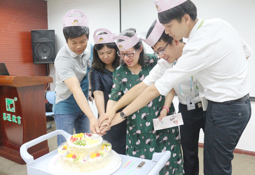 例會,為老師們慶生已是一種常態(tài),但是七月生日會卻略顯不同,當(dāng)易道教育集團(tuán)常務(wù)副總經(jīng)理、副校監(jiān)與易道教育集團(tuán)副總經(jīng)理、加盟運(yùn)營事業(yè)群總監(jiān)季穎女士與老師們同上臺接受大家祝福的時候,他們可愛的舉動也就像孩子們一樣,易道教育之所以讓人為之著迷,正是因?yàn)槿绱恕R椎朗且凰镜褚粋€大家庭,我們在這里奮斗,努力并快樂著!
