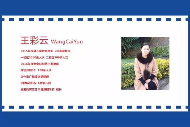 2015年投身兒童教育事業,或許無知,故而無畏。她以70后固有的沉穩和堅定的信念,使團隊和校區迅速游向成功者的行列,2所直營校區,一校區1000余人次。二校區300余人次,全職員工24位。2016年開始全日制幼小銜接班。成功開班8個,180余人次。收費5500元/學期,單項目學期收入100余萬元。合作推廣戰績亦是輝煌!9家培訓機構,6家幼兒園,自由連鎖,花開豐縣。不忘初心,方得始終。大方,大膽,大無畏,是她,易道教育江蘇豐縣旗艦學校 王彩云校長。