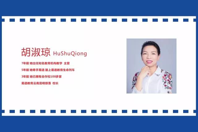 不忘初心,方得始終,初心易得,始終難守。她卻,用最初的心,在做永遠的教育!7年前,她出任知名教育機構教學主管,這一年,她僅畢業3年。5年前,她牽手易道,踏上易道教育生命列車。3年前,她已擁有合作校100多家,現在,傳奇仍在繼續……。志存高遠,無懼將來方能守住繁華。她,少年芳華,不盡溫柔。她,巾幗英雄,不讓須眉。她就是,易道教育云南昆明部落胡淑瓊校長。