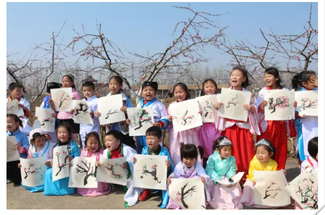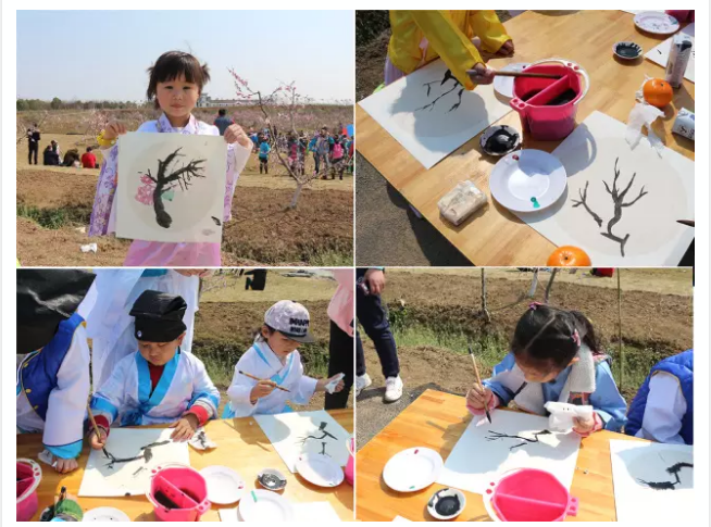 玩了一上午可把寶貝們累壞了,不過(guò)很快就到了農(nóng)家大鍋飯環(huán)節(jié),每一位家長(zhǎng)和孩子都參與其中。找菜、洗菜、燒菜、擺盤(pán)、分菜等,分工明確,忙的不亦樂(lè)乎,吃著自己做的飯,格外美味,寶貝和家長(zhǎng)臉上都洋溢著幸福的笑容。中午吃完午餐稍作休息儲(chǔ)存好體力后,下午繼續(xù)“桃”學(xué)游。下午的第一站就是奶牛樂(lè)園里的水蜜桃基地,三月正是桃花盛開(kāi)時(shí)節(jié)邁進(jìn)桃花園,一股花香就撲鼻而來(lái)讓人陶醉,再往里走,就看到了滿園春意,凈是粉紅的桃花,這般美景瞬間就讓人感覺(jué)來(lái)到了世外桃源,借著這滿園春意我們開(kāi)始了第一節(jié)“桃”學(xué)課林雅韻.國(guó)學(xué)誦讀課。寶貝們身著漢服,朗誦國(guó)學(xué)詩(shī)經(jīng),聲音洪亮,慷慨激昂,抑揚(yáng)頓挫,聲情并茂,接下來(lái)就是我們的第二節(jié)“桃”學(xué)課,桃林雅韻·趣墨國(guó)畫(huà)課。