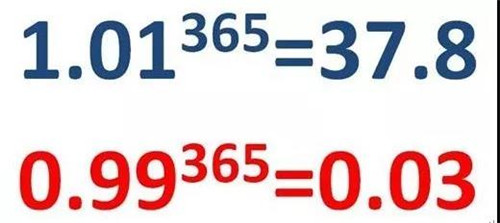 這個公式很好的詮釋了每天進步一點點的重要性,每個人都是組織的一員,團隊的一員,要改變自己的思維,從自己的變化和進步就能看到團隊的變化和進步。作為黨員,我們要起到模范帶頭作用,要走在群眾的前面。