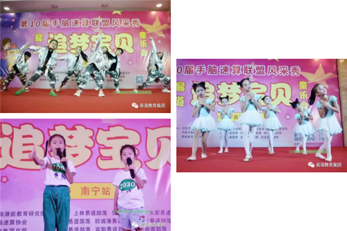 除了超級精彩的手腦速算風(fēng)采展示,易道教育廣西區(qū)多才多藝的小朋友們,還為現(xiàn)場觀眾帶來了好看又好玩的才藝表演。