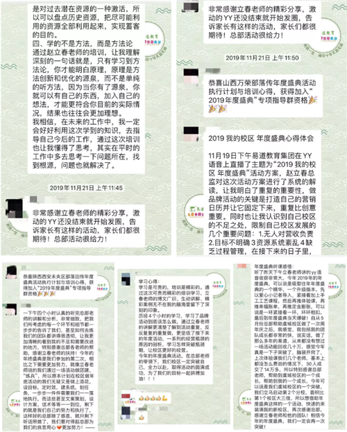 在執行2019年度盛典活動的過程中,總部老師通過建立專項指導群,不分晝夜地對方案實施的每個環節進行拆解、培訓、答疑,幫助部落校長解決問題,為更多校區提供實戰經驗。