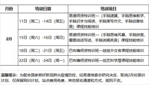 經(jīng)易道教育總部培訓(xùn)委員會(huì)研究決定,取消2月精品教師線下培訓(xùn),保留線上網(wǎng)絡(luò)培訓(xùn)。