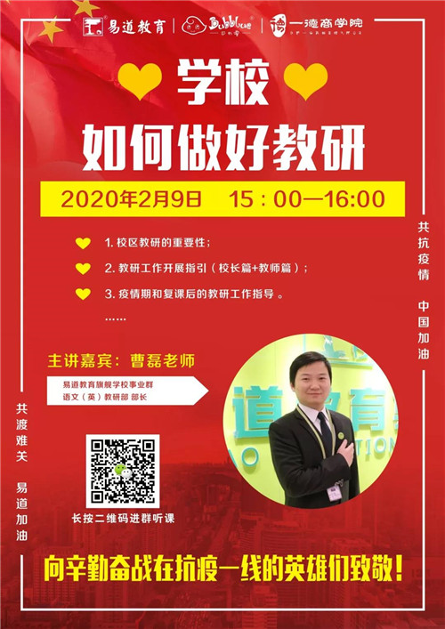 2020年2月9日15:00-16:00,易道教育旗艦學校事業群語文(英)教研部部長曹磊老師,帶來《學校如何做好教研》微課。為易道全國2000+校區校長、校區骨干,以及各教育同仁們指導教培機構的教研工作。