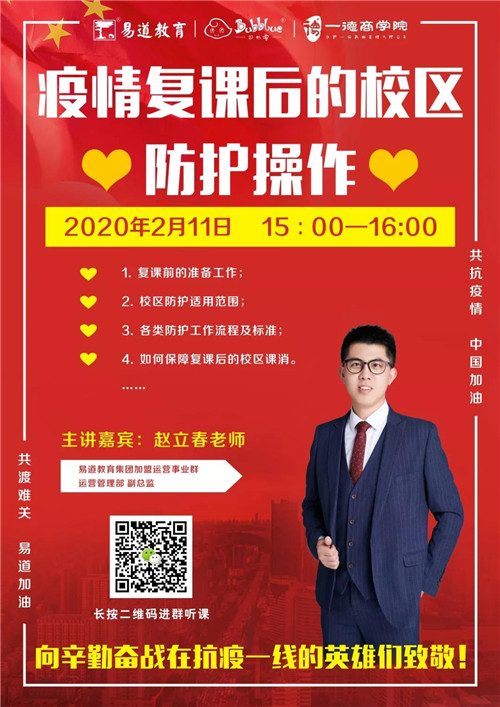 2月11日15:00-16:00,易道教育集團總部運營管理部副總監趙立春老師,帶來線上微課《疫情復課后的校區防護操作》。這是聲與聲的交流,更是心與心的鏈接!