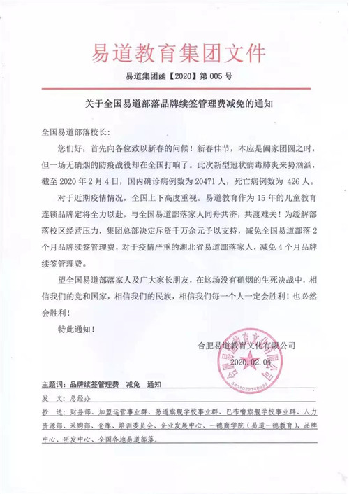 2月4日,易道教育集團總部下發文件,減免全國部落千萬管理費。面向全國部落,減免2個月管理費。面向疫情較為嚴重的湖北地區各部落,減免4個月管理費。只為彼此牽手,共抗疫情難關!