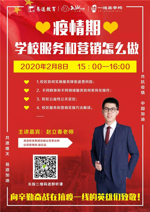 2020年2月8日下午15時,易道教育集團總部運營管理部副總監(jiān)趙立春老師,帶來《疫情期,學校服務和營銷怎么做》線上微課。幫助易道全國2000+校區(qū)校長、校區(qū)骨干,以及各教育同仁們緩解當下校區(qū)運營問題。
