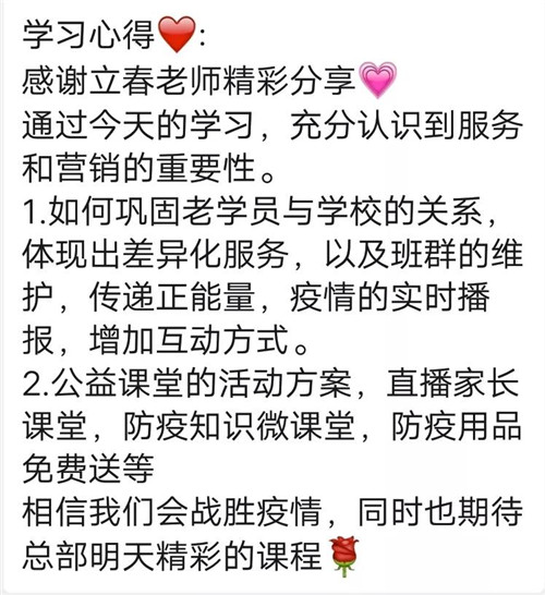 趙立春老師說:患難見真情,在特殊時期更需要關愛,堅持服務屬性>教學屬性,給予老生家長恰如其分的服務,差異化的服務,不讓家長產(chǎn)生過度焦慮的服務。