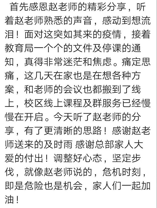 疫情當前,隔斷的是空間,隔不斷的是易道愛的文化和教育。每天的微課結束后,各大直播微信群內的校長和校區骨干們反響都十分熱烈,第一時間在群內留下心得感悟,紛紛表示受益匪淺,收益良多,字里行間更是透露著對總部的感恩和感激。