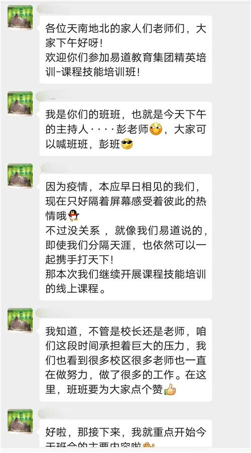 開課前的云班會上,班主任詳細介紹線上培訓的注意事項,讓每位參訓老師都能感受到易道總部的愛~