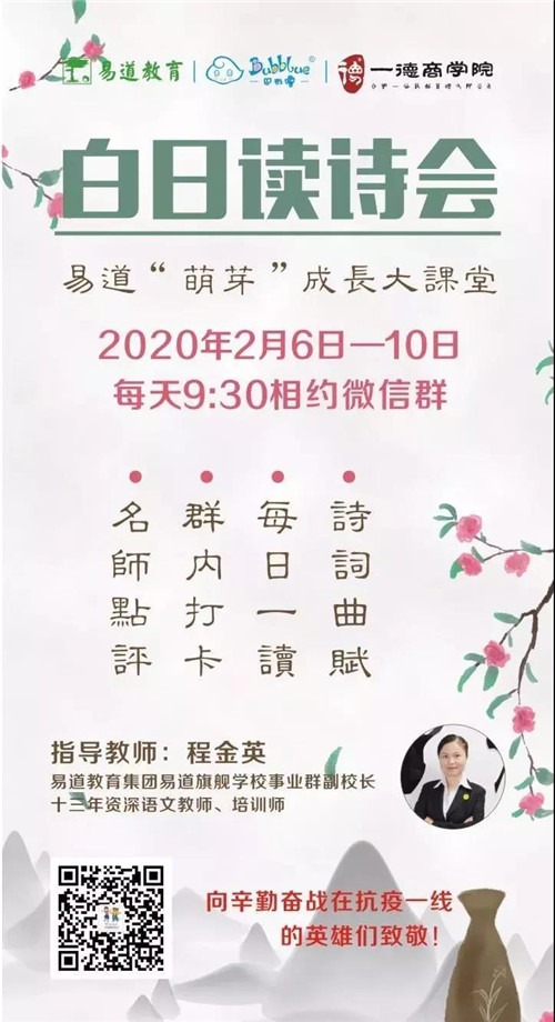 疫情當(dāng)前,易道教育始終心系每一位易道寶貝。『白日讀詩會』作為『萌芽大課堂』的第一篇章,旨在和孩子一起走進(jìn)唐詩宋詞元曲的殿堂,吸收古詩詞的精華,用古詩古韻抗擊疫情。