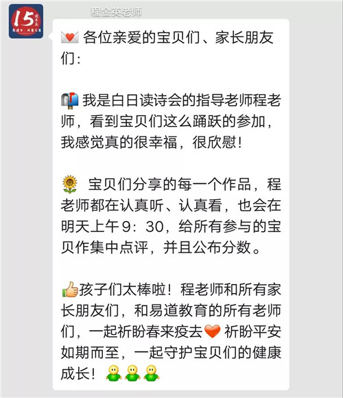 『白日讀詩會』開課期間,受到了許多家長的關(guān)注和支持,每天的微信群內(nèi),孩子們認(rèn)真聽課,積極完成作業(yè),課后家長們還會發(fā)表感言。再次感謝家長們一直以來的支持和關(guān)注,易道將會把更好的教育帶給寶貝們!
