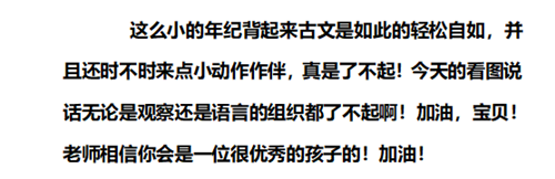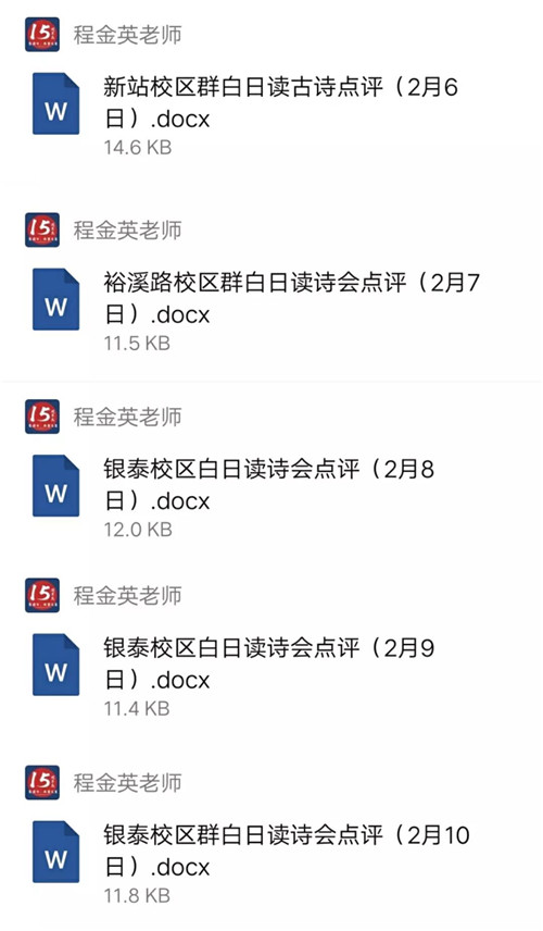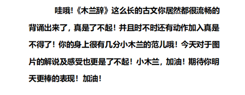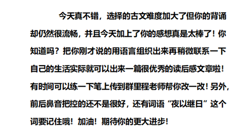 學(xué)習(xí)期間,程金英老師每日和孩子們一起,準(zhǔn)時在群內(nèi)打卡,也為孩子們加油鼓勵。在家長們發(fā)出孩子朗誦詩詞曲賦的視頻后,程老師針對每個寶貝一一做點評,并整理成文檔發(fā)送到群內(nèi)。