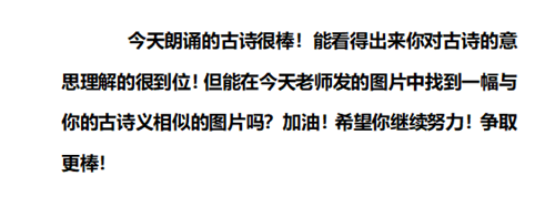 為了孩子們的學(xué)習(xí)更上一層樓,程老師在群里“升級打卡”。除了誦讀自己準(zhǔn)備的詩詞文章以外,根據(jù)老師發(fā)出的圖片描述圖片內(nèi)容,最后猜猜圖片與哪首古詩最為契合。這樣一來,就能夠做到學(xué)以致用。