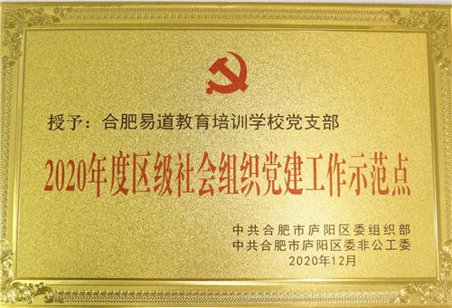 近日,中共合肥市廬陽區委組織部、中共合肥市廬陽區委非工委聯合下發通知,確定合肥易道教育培訓學校黨支部為2020年度區級社會組織黨建工作示范點。