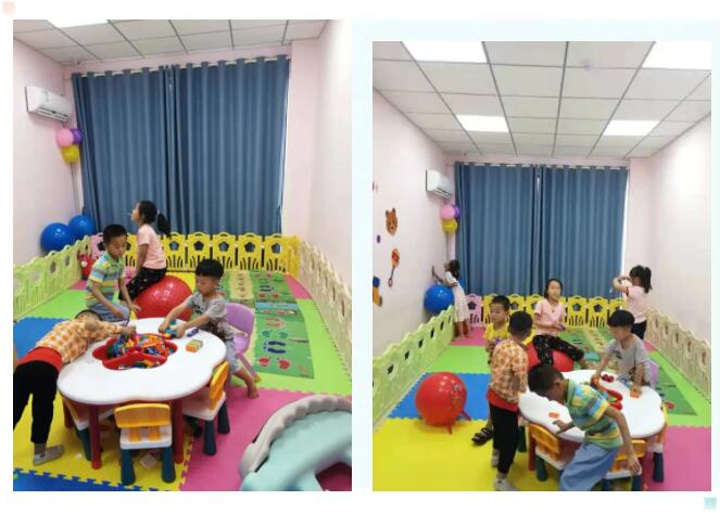 零食區、游戲區,小朋友們早就吃開玩嗨啦,瑜伽球、樂高積木,既能鍛煉身體也能助益大腦。