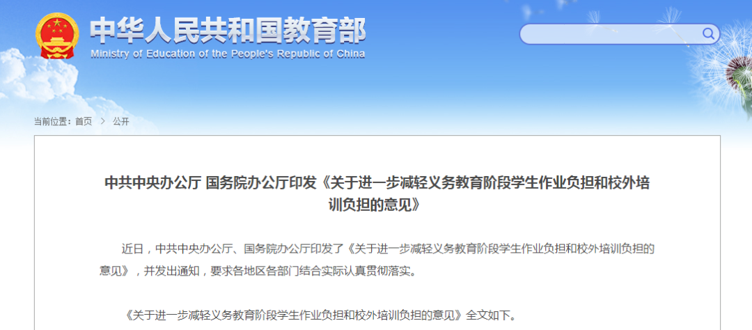 7月24日,中共中央辦公廳、國務院辦公廳發布《關于進一步減輕義務教育階段學生作業負擔和校外培訓負擔的意見》。