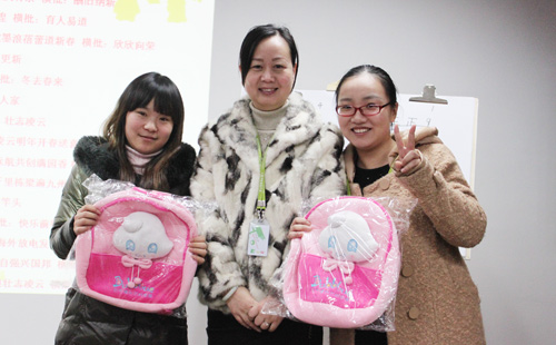會議第一項是“易道家人,蛇年春聯(lián)大PK”,全體老師通過投票選出最優(yōu)秀的兩幅春聯(lián),最終由旗艦校史赟老師和舒云老師獲勝,總經(jīng)辦趙老師為兩位獲獎?wù)哳C發(fā)巴布嚕書包作為獎品。第二項是總經(jīng)辦領(lǐng)導(dǎo)為每一位老師都發(fā)放了一支16G易道珍藏版U盤作為新年禮物,這不僅僅是U盤,每一支U盤里都有一段視頻,那是每位老師對自己父母最好的祝福,還有大家長祝媽媽對每位老師父母的祝福,裝U盤的盒子下面還有一封飄著淡淡墨香的家書,是祝老師親筆寫給每位老師父母的家書,最好的禮物,溫暖的祝福。最后一項是最激動人心的,總經(jīng)辦領(lǐng)導(dǎo)派發(fā)紅包啦,每位拿到紅包的老師都很是高興,心里都感謝著易道,身為易道大家庭中的一員,真好!