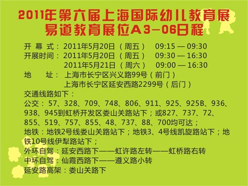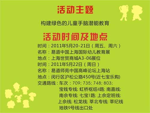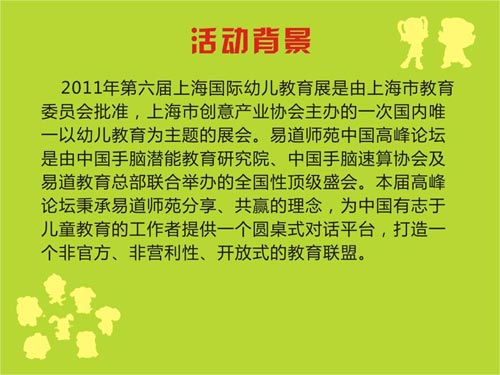 在中國上海舉辦的2011年第六屆上海國際幼兒教育展是由上海市教育委員會批準,上海市創意產業協會主辦的一次國內唯一以幼兒教育為主題的展會。易道師苑中國高峰論壇是由中國手腦潛能教育研究院、中國手腦速算協會及易道教育總部聯合舉辦的全國性頂級盛會。