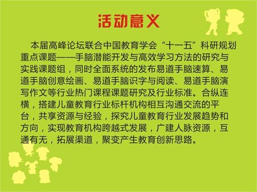 本屆高峰論壇由中國手腦潛能教育研究院、中國手腦速算協會主辦,秉承易道師苑分享、共贏的理念,為中國有志于兒童教育的工作者提供一個圓桌式對話平臺,打造一個非官方、非營利性、開放式的教育聯盟。經研究商議,定于2011年5月22日在中國上海市舉行。