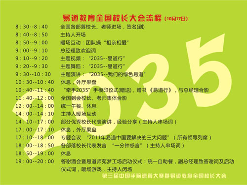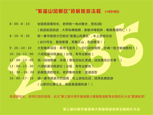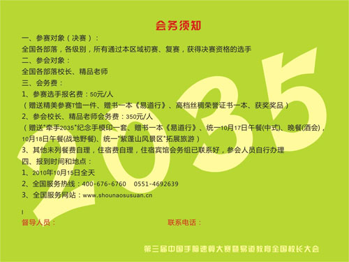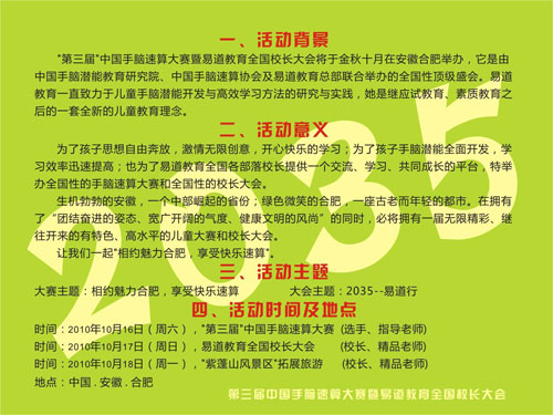 中國手腦潛能研究院、中國手腦速算協會聯合易道教育(中國)投資控股有限公司、合肥易道教育文化有限公司(易道中國總部)、深圳市易道教育咨詢有限公司將于2010年10月16日至18日在易道中國總部合肥舉辦“第三屆中國手腦速算大賽暨易道教育全國校長大會”,屆時歡迎廣大學生家長及易道部落校長前來參加,具體活動細則與安排請參照邀請函,以下為邀請函內容: