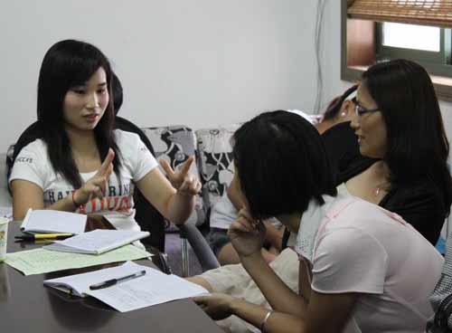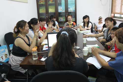 “實踐出真知”,來自廣東省中山市的加盟商在討論。