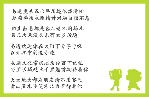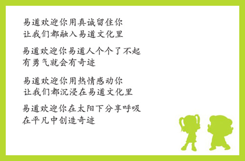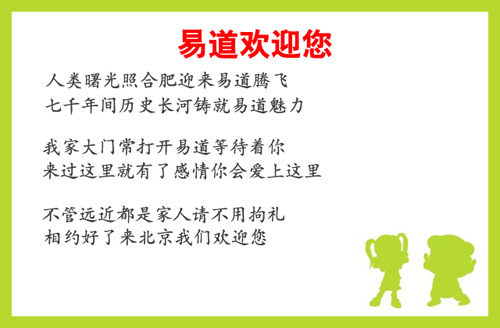 為慶祝2011年易道教育全國校長大會舉行,易道教育河南新鄭部落吳永濤校長特填寫《易道歡迎您》的歌詞,文采斐然,筆意縱橫。易道教育總部在此向吳校長表示衷心的感謝,并祝愿吳校長事業有成,河南新鄭部落蒸蒸日上!