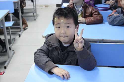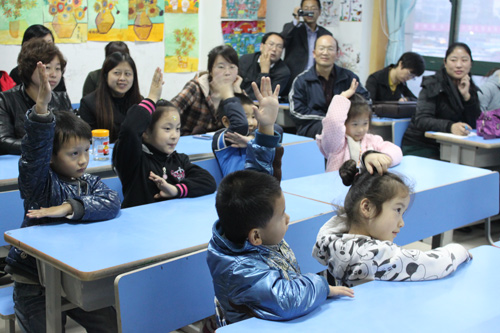 “小手預備!”易道總部程金英老師滿帶笑容地和孩子們進行手腦速算練習,孩子們個個都回答得又快又準,讓在座的老師們感到十分驚訝。幾輪題目結束,孩子們的小腦袋上都貼上了漂亮的易道獎花,大家搶著回答問題,課堂氣氛非常熱烈。