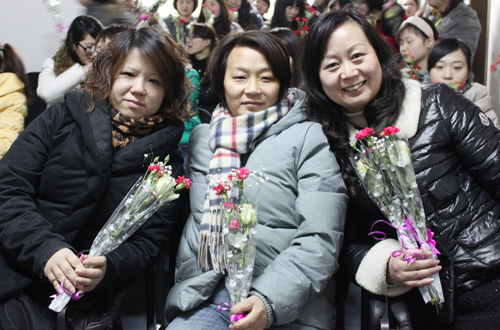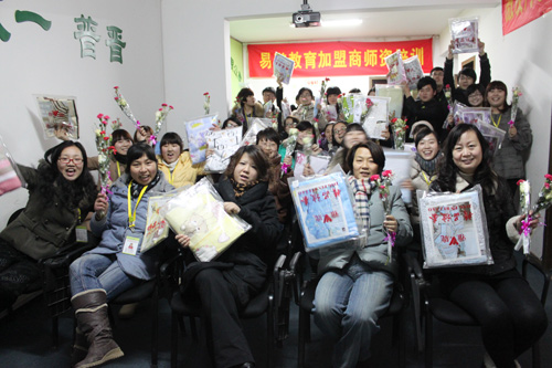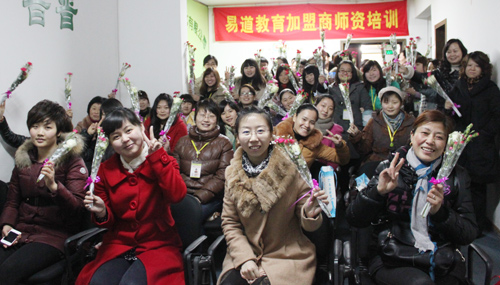 3月8日上午,在加盟商培訓講座結束之后,易道總部全體老師和本期加盟商共聚一堂,為各位美麗的女老師們獻上節(jié)日的祝福。總部領導為大家精心準備了一束束美麗的鮮花,還有溫馨實用的禮品。易道“四大天王”充當一回送花使者,非常紳士地為每位女老師獻上鮮花。老師們其樂融融、喜氣洋洋地共享溫馨的時刻。