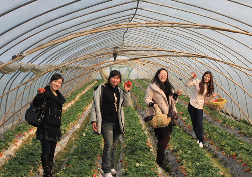 三月,大圩的草莓熟了!易道旅游團的成員們抵達草莓基地,推開車門,看到一望無際的草莓田。紅彤彤的果兒像是璀璨的寶石,掛在墨綠的桿兒上,撲鼻的甜味讓人醉心不已。果農樂呵呵地向大家介紹,“今年的草莓收成非常好,你們采些嘗嘗,地里的莊稼就是新鮮!”