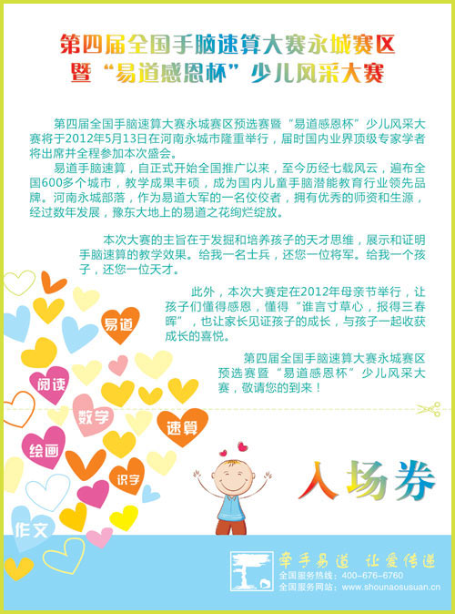 第四屆全國(guó)手腦速算大賽永城賽區(qū)預(yù)選賽暨“易道感恩杯”少兒風(fēng)采大賽將于2012年5月13日在河南永城市隆重舉行,屆時(shí)國(guó)內(nèi)業(yè)界頂級(jí)專(zhuān)家學(xué)者將出席并全程參加本次盛會(huì)。