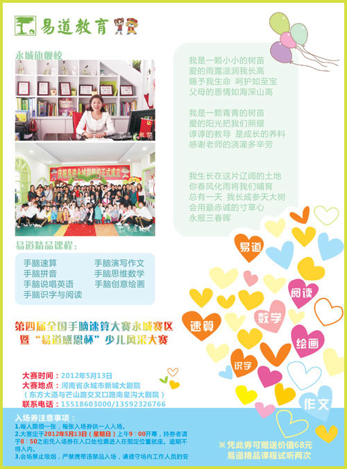 第四屆全國(guó)手腦速算大賽永城賽區(qū)預(yù)選賽暨“易道感恩杯”少兒風(fēng)采大賽,敬請(qǐng)您的到來(lái)!