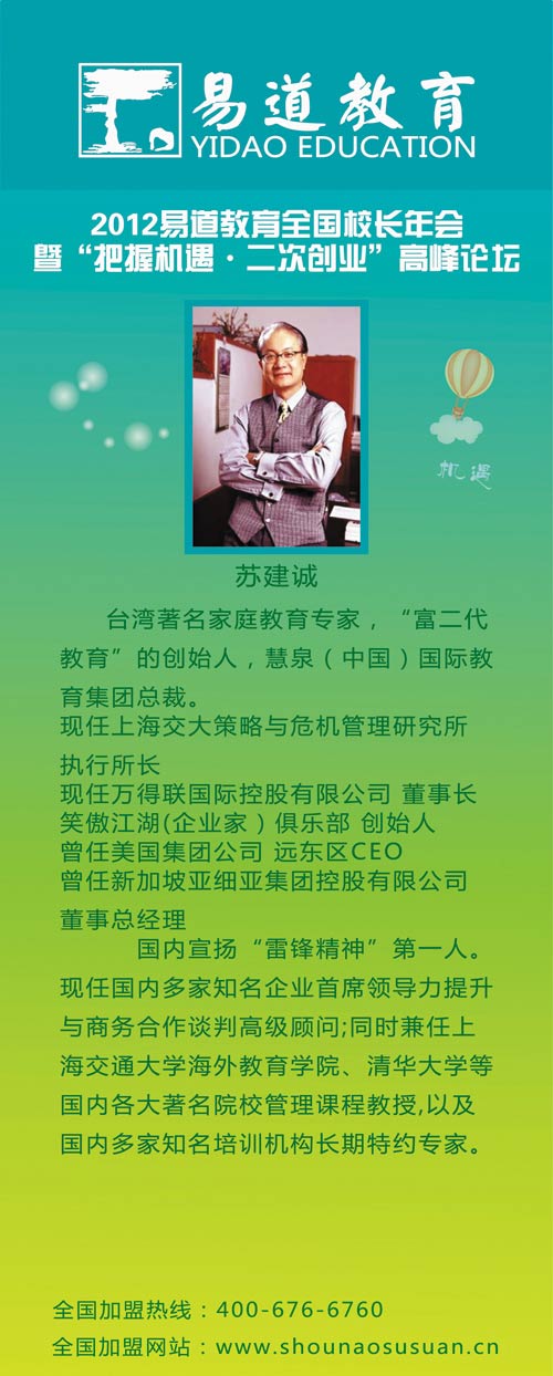 2012年11月19日上午九點,當今中國培訓界“言傳身教”的倡導者和實踐者、“富二代教育”的創始人、臺灣著名家庭教育專家蘇建誠教授在本次易道教育全國校長年會上帶來了他的精品講座《合作藝術:談出天下》。