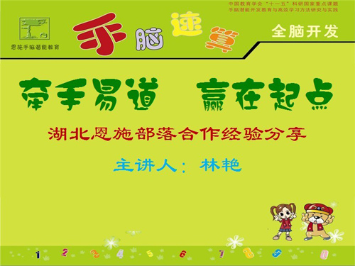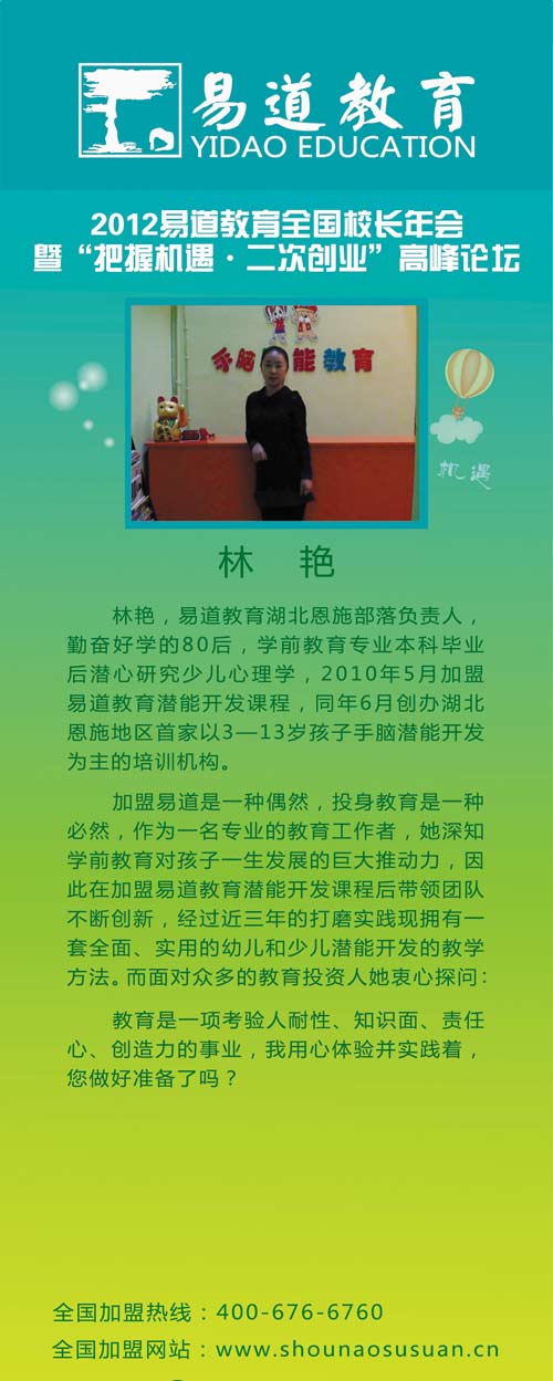 2010年5月,她加盟了易道教育的特色課程,同年6月她創辦了湖北恩施地區首家以3—13歲孩子手腦潛能開發為主的培訓機構。加盟易道是一種偶然,投身教育是一種必然,作為一名專業的教育工作者,她深知學前教育對孩子一生發展的巨大推動力,因此在加盟易道教育潛能開發課程后帶領團隊不斷創新,經過近三年的打磨實踐,現今擁有一套全面、實用、適合的幼兒和少兒潛能開發的教學方法。而面對眾多的教育投資人她衷心探問:教育是一項考驗人耐性、知識面、責任心、創造力的事業,我用心體驗并實踐著,您做好準備了嗎?