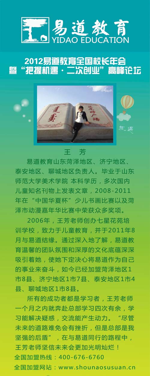 她年輕,她優(yōu)秀,她的文章多次出現(xiàn)在國內知名兒童刊物上,她的名字常常出現(xiàn)在“中國華夏杯”少兒書畫比賽的頒獎典禮上,她就是——王芳。2011年8月她與易道結緣,通過深入地了解,易道教育溫馨的團隊氛圍和深厚的文化底蘊深深地吸引著她,使她下定決心將易道作為自己的事業(yè)來奮斗。加盟易道不過15個月,她將自己的教育事業(yè)做的如日中天,這期間,結婚,生子,人生喜事一樣沒耽誤。她是幸福的母親,她是成功的兒童教育專家。