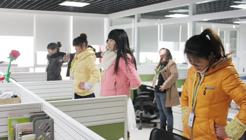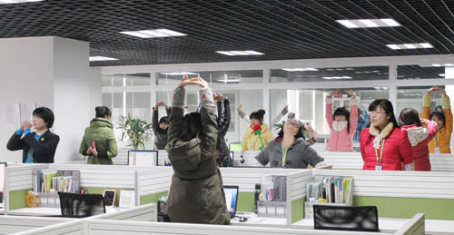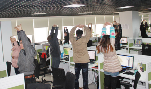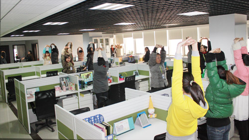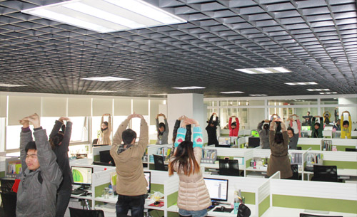 輕柔的音樂,配上舒緩的瑜伽動作,雖然短短十分鐘,也能讓人渾身舒暢一整天。現在每天下午三點半,瑜伽音樂會準時響起,所有老師都會起立并在自己的工位上,隨著音樂節拍慢慢的做起“課間”瑜伽。這是由手腦操事業部總監盛潔老師組織,李懷楊老師指導的健康易道之行。